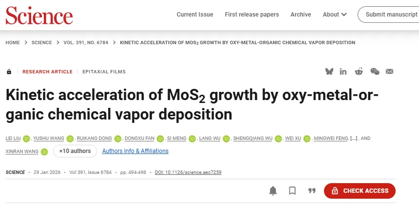 南京大学王欣然教授、李涛涛副教授,东南大学王金兰教授等人在《Science》上发表了题为“Kinetic acceleration of MoS2 growth by oxy-metal-organic chemical vapor deposition”的研究论文。该研究针对传统金属有机化学气相沉积(MOCVD)制备二维MoS2时存在的生长动力学缓慢、晶粒尺寸小及碳杂质污染等关键问题,创新性地提出了氧辅助MOCVD(oxy-MOCVD)技术。该技术通过在Mo(CO)6与CS2前驱体中引入氧气,将反应路径重构为生成高纯度MoO3与单质硫的路径,从而显著降低了反应能垒,加速了生长动力学。实验结果表明,该方法在蓝宝石衬底上成功制备出单向排列的MoS2晶畴,尺寸可达数百微米,生长速率较传统方法提升2-3个数量级,且完全消除了碳杂质。材料表现出优异的光学质量与极高的电学性能,其场效应晶体管平均迁移率超过100 cm2·V-1·s-1,开关比达108–109。研究进一步展示了该技术在150毫米晶圆尺度上的扩展能力,制备的MoS2薄膜在厚度、发光及结晶取向方面均表现出出色的均匀性,验证了其面向产业化应用的巨大潜力。这项工作不仅提供了一种高性能二维半导体的制备方案,更展示了一种通过调控前驱体化学反应动力学来实现材料高质量外延的新范式。