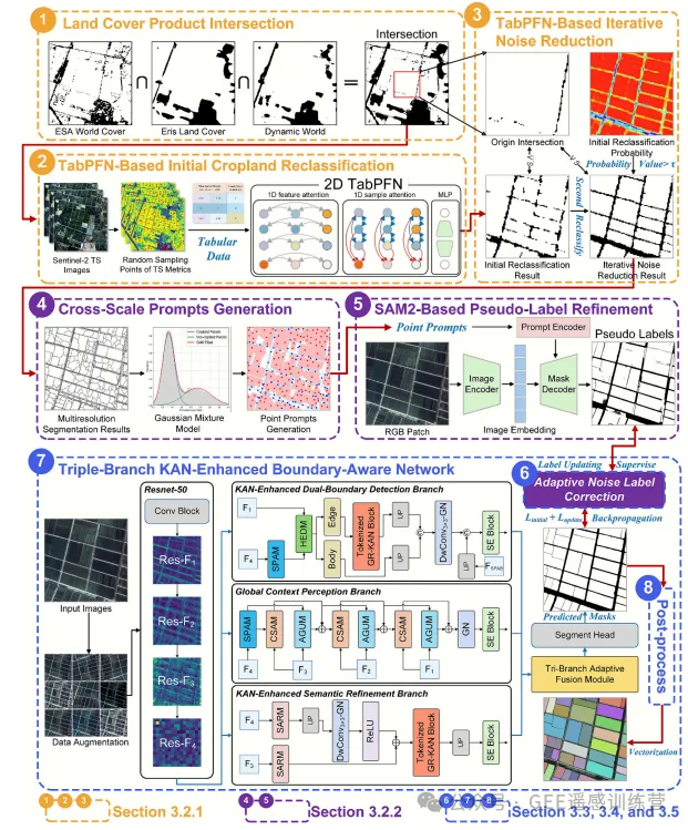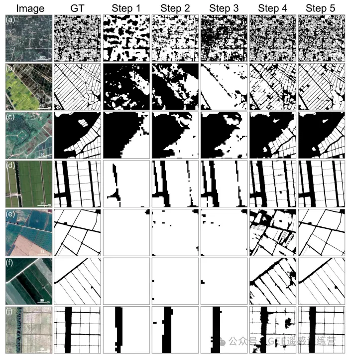 图 14.跨尺度伪标签优化的分步贡献定性对比。影像:0.5 米分辨率谷歌地球影像;GT:真实标签;步骤 1:土地覆盖先验初始化(LCPI);步骤 2:土地覆盖先验初始化→迭代类别细化(ICR);步骤 3:土地覆盖先验初始化→迭代类别细化→迭代噪声去除(INR);步骤 4:土地覆盖先验初始化→迭代类别细化→迭代噪声去除→跨尺度提示生成(CPG);步骤 5:土地覆盖先验初始化→迭代类别细化→迭代噪声去除→跨尺度提示生成→基于 SAM2 的伪标签优化(SPR)。