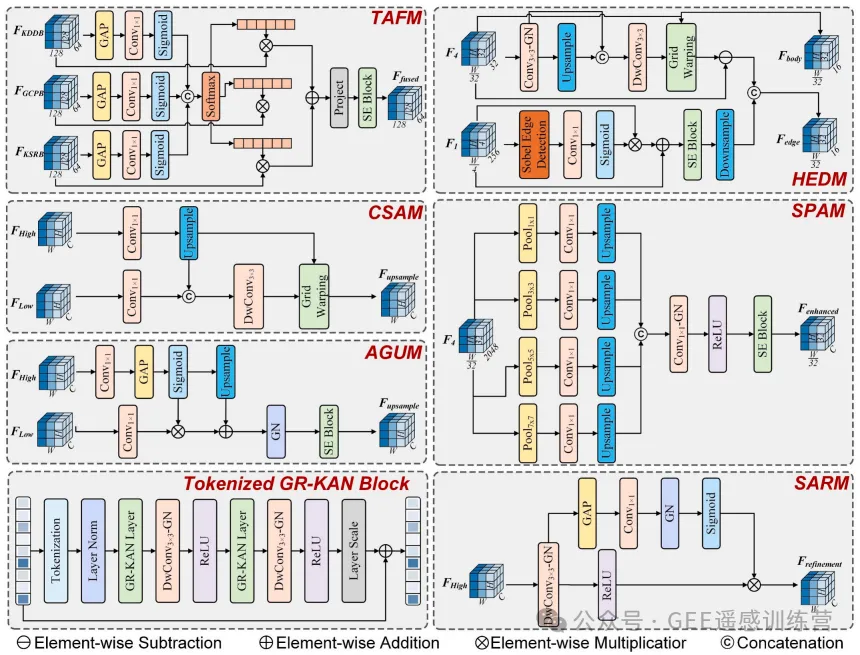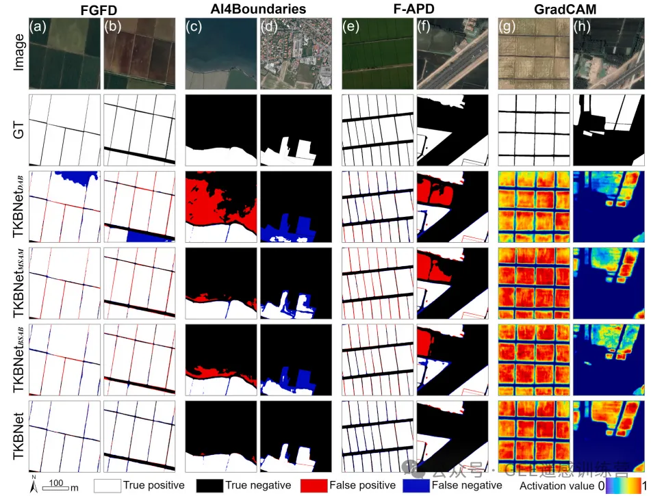 图 15.Transformer - 知识增强骨干网络(TKBNet)的消融实验结果定性对比。影像:0.5 米分辨率谷歌地球影像;GT:真实标签;(a-f)三种数据集上不同模型的分割结果对比,红色表示假阳性,蓝色表示假阴性;(g-h)对应的梯度加权类激活映射(Grad-CAM)热力图。