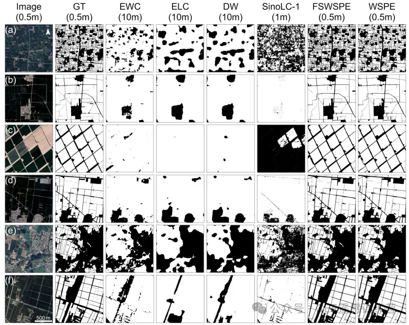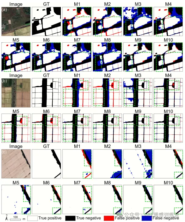 图 9.弱监督农业地块提取(WSPE)框架的消融实验结果定性对比。影像:0.5 米分辨率谷歌地球影像;GT:真实标签;配置 M1-M10 对应表 4 中报告的实验设置。