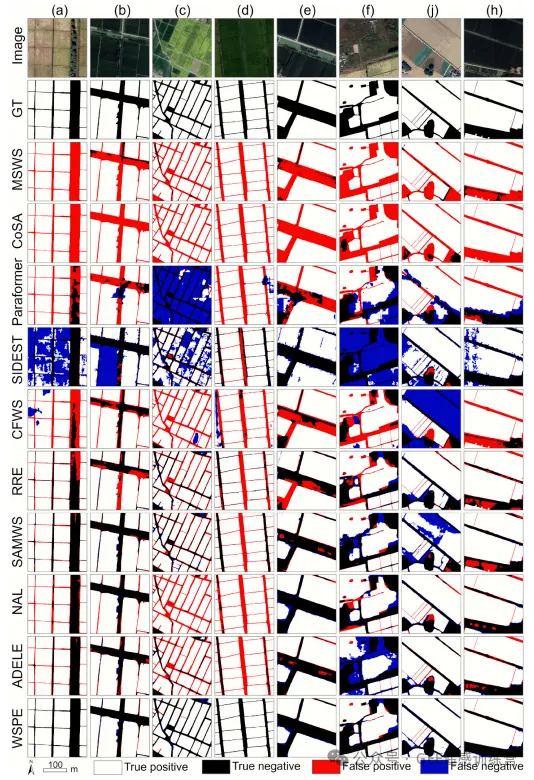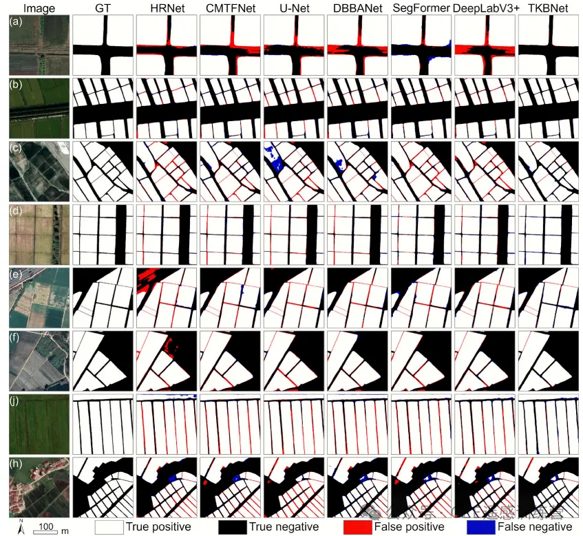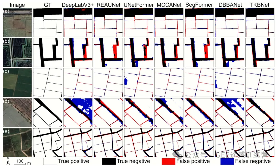 图 6. F-APD 数据集上,Transformer - 知识增强骨干网络(TKBNet)与当前主流语义分割方法的定性对比。影像:0.5 米分辨率谷歌地球影像;GT:真实标签。