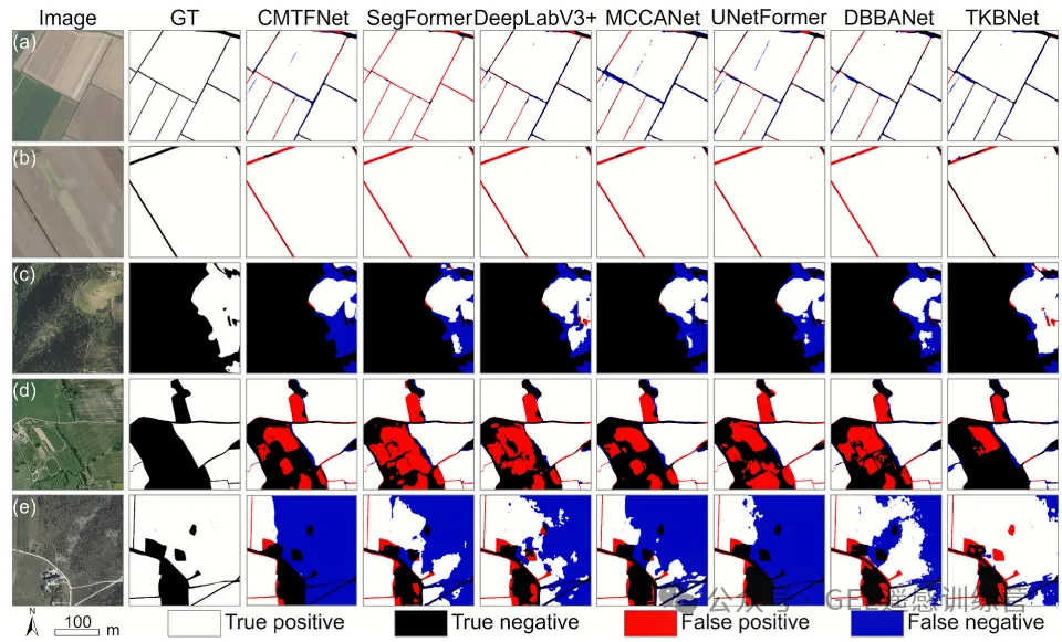 图 8.FGFD 数据集上,Transformer - 知识增强骨干网络(TKBNet)与当前主流语义分割方法的定性对比。影像:0.5 米分辨率谷歌地球影像;GT:真实标签。