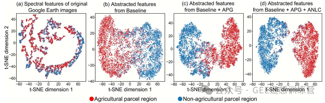 图 11.弱监督农业地块提取(WSPE)框架不同阶段特征的 t - 分布随机邻域嵌入(T-SNE)可视化。