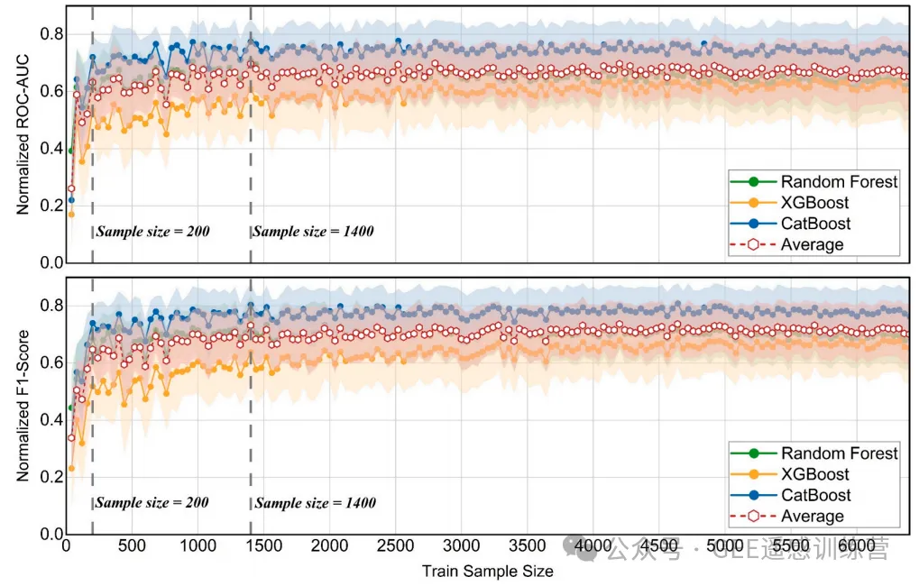 图 12.随机森林(Random Forest)、极端梯度提升(XGBoost)、类别梯度提升(CatBoost)及其平均值的训练样本量消融曲线。上图为归一化的 ROC 曲线下面积(ROC-AUC),下图为 F1 分数,均以训练样本数量为横坐标绘制。