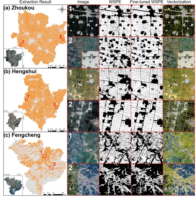 图 18.弱监督农业地块提取(WSPE)框架在三个大规模研究区的制图与矢量化结果。(a)周口;(b)衡水;(c)丰城;最左侧列展示全监督弱监督农业地块提取(F-WSPE)的大规模农业地块提取结果,其余列展示放大后的局部结果及对应的矢量化成果。
