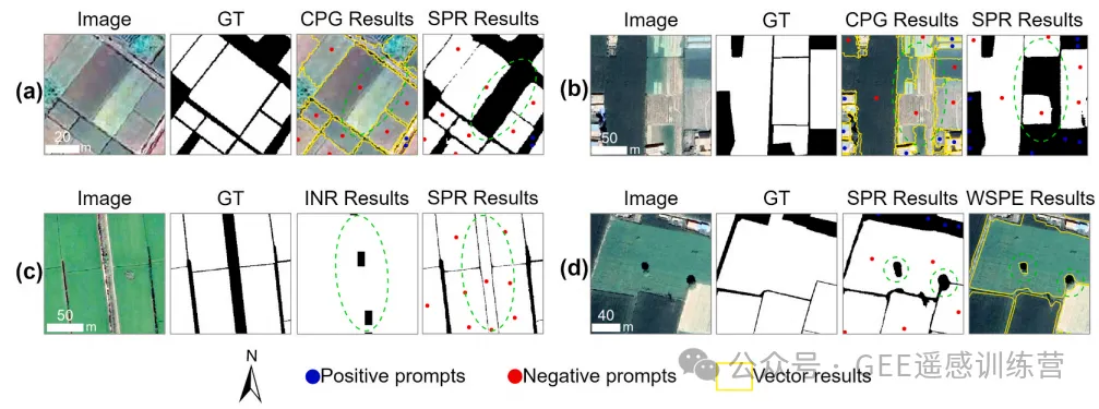 图 19.复杂农业条件下弱监督农业地块提取(WSPE)框架的代表性失效案例。INR:迭代噪声去除;CPG:跨尺度提示生成;SPR:基于 SAM2 的伪标签优化。