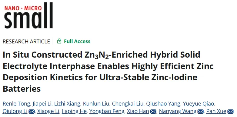 近日,南京工业大学李秋龙、扬州大学薛攀团队于国际知名期刊《Small》发表最新的研究成果。该研究提出一种基于平面共轭高分子全氟酞菁铜(FCP)的新型电解液添加剂策略,以构建富含Zn3N2的无机-有机杂化SEI层,具有扩展的π共轭结构的FCP能有效地加速平面内电子转移,并产生离域电场,促进Zn2+的快速迁移除溶剂化作用外,FCP在电极表面形成稳定的双电层,抑制局部电场,防止Zn与水直接接触,从而有效抑制副反应。FCP对Zn2+也表现出很强的亲锌性,有效引导其均匀迁移和沉积。最重要的是,源自FCP的富含Zn3N2的无机-有机杂化SEI层显著加速了Zn2+的传输,消除了浓差极化,并提供了显著增强的循环稳定性。组装的对称电池在20和50 mA cm-2的大电流密度下也能保持稳定操作超过6000次循环。此外,集成到Zn-I2电池中时,该系统具有出色的循环稳定性,在50 C的倍率下循环65000次后仍保持80.9%的容量。