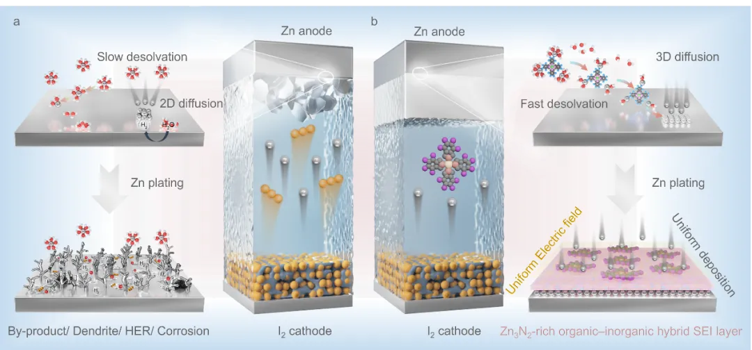 目前,改善锌负极电化学性能的策略主要包括:电极结构、电极保护层设计和电解质工程设计。总的来说,界面调节被认为是实现Zn-I2稳定运行的关键切入点。在这些方法中,构建先进的固体电解质界面(SEI)层已被确定为解决这些挑战的最有前途的方法之一。然而,在传统的硫酸锌(ZnSO4)电解质体系中形成的SEI层由于其单组分性质导致离子电导率差和结构不均匀(无机物质),使其机械脆弱,易于开裂或分层。这导致连续SEI增厚,内阻增加,电解质耗尽,和容量衰减。