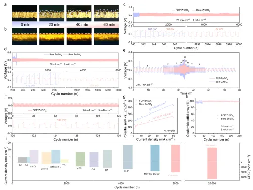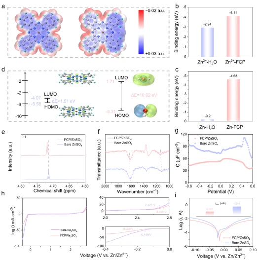 FCP的大环共轭结构使得π电子云均匀分布,能够在整个环骨架上自由移动,促进Zn²⁺与电子在面内快速传输,降低电池界面阻抗与体相阻抗,从而均匀化电场分布和Zn²⁺通量。同时FCP丰富的亲锌官能团N、F原子通过其强极性,能够吸附Zn²⁺并与金属Zn产生相互作用,降低Zn²⁺成核过电位,促进Zn²⁺在电极表面均匀成核,避免尖端效应形成枝晶,促进水合Zn²⁺的去溶剂化。FCP还能吸附在电极表面形成稳定的电双层结构,均匀化局部电场,并防止Zn负极与水直接接触,从而有效抑制副反应的发生。