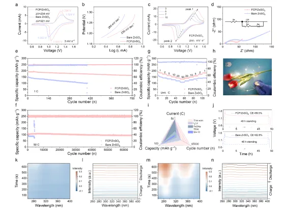 得益于上述优势,组装的对称电池能够实现超长的循环寿命,在电流密度为20 mA cm-2时可超过6000次循环,并且在极高电流密度为50 mA cm-2时仍能保持稳定运行超过6000次。此外,锌负极展现出极高的电化学效率(CE)为98.7%,且在含FCP的电解液中进行电镀/剥离操作时表现出优异的可逆性。当集成到Zn-I2电池中时,该系统展现出卓越的循环稳定性,在高倍率50 C下进行65000次循环后仍能保持80.9%的容量。