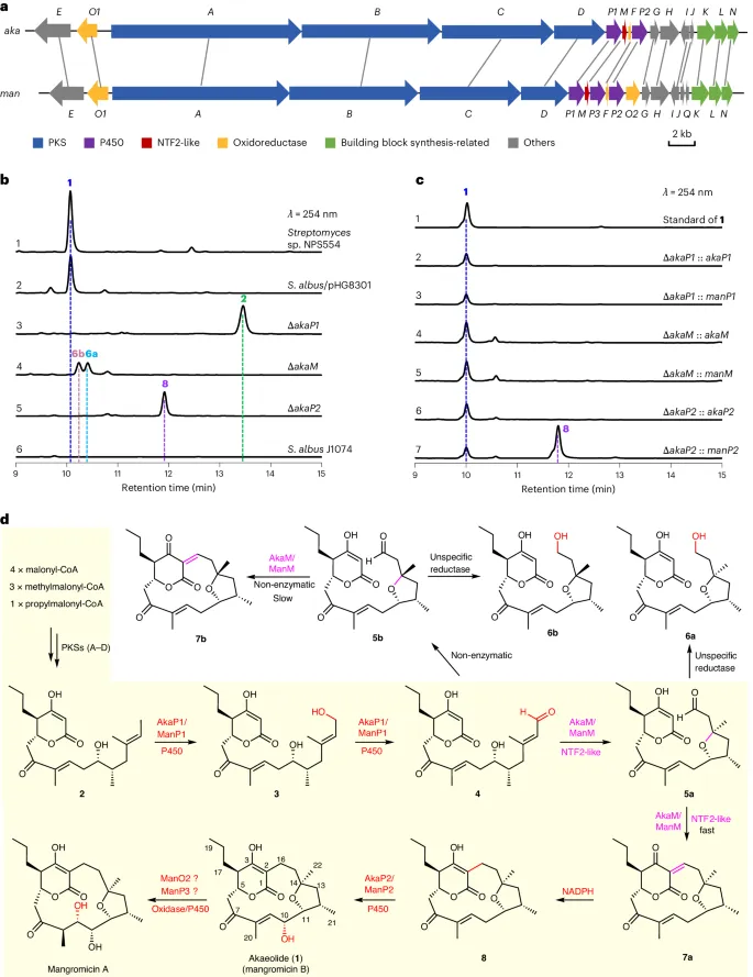 AKA和MAN的生物合成基因簇(BGCs)高度保守,均编码四种具有相同模块和结构域的巨型I型聚酮合酶(图1a及补充表3和表4)。此外,两个基因簇均编码一组同源修饰酶,包括两种P450酶(P1和P2)、一种核转运因子2(NTF2)样酶(M)、一种氧化还原酶(O1),以及负责合成稀有丙二酰辅酶A构建单元的酶(K、L、N)——该构建单元也参与FK506的生物合成。