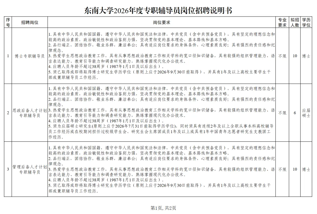 具体岗位职责及要求详见《东南大学2026年度专职辅导员岗位招聘说明书》,见附件。