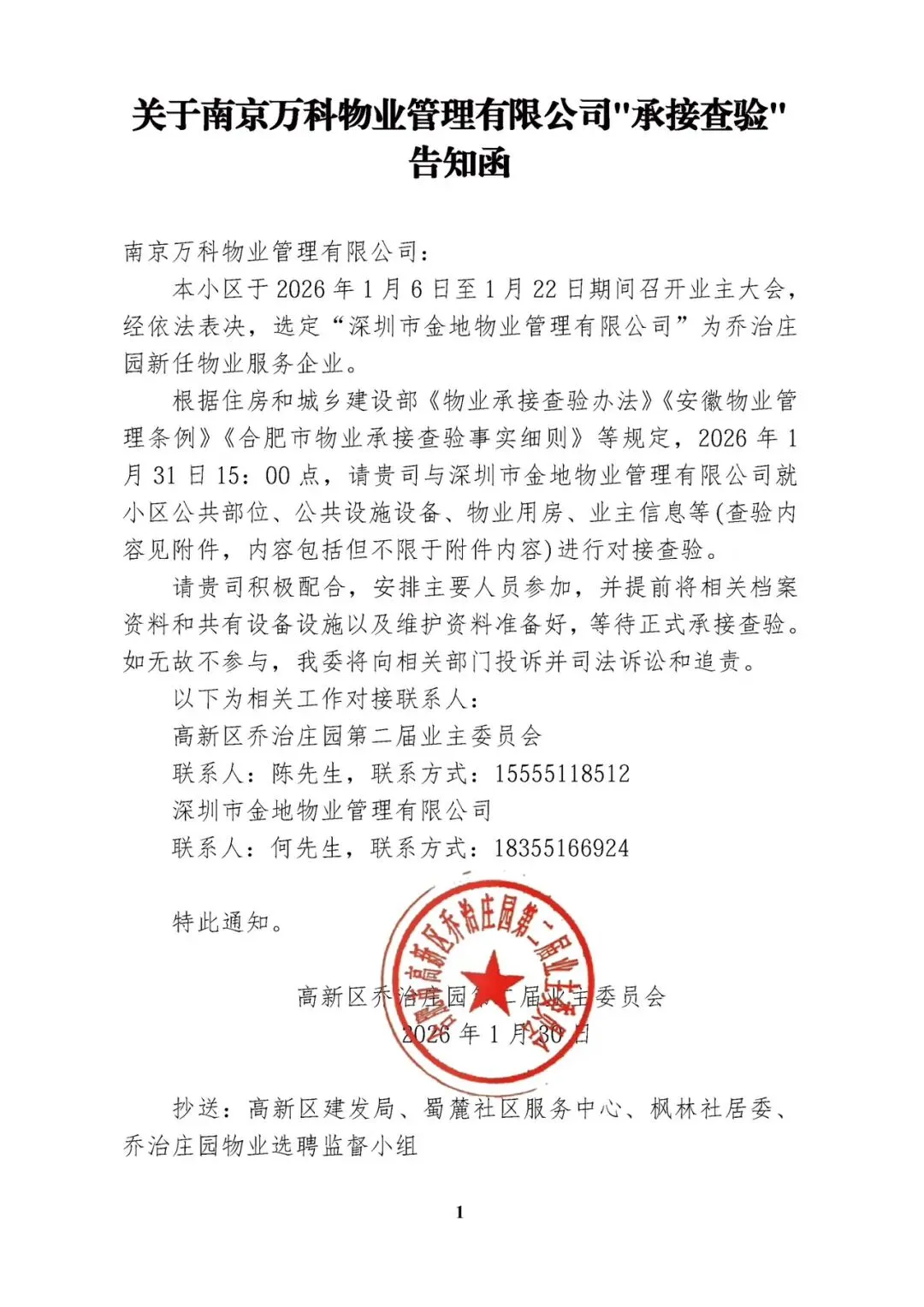 >关于南京万科物业管理有限公司“承接查验”告知函