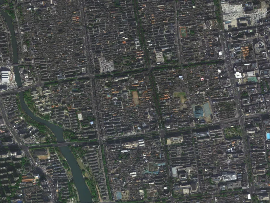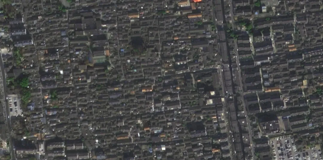 卫星图上几乎看不到大型封闭小区。建筑以2-3层的坡顶民居为主,沿街巷密集排列,公共巷道(弄堂)直接通向每户门前。这是“小街区、密路网”的古代典范。