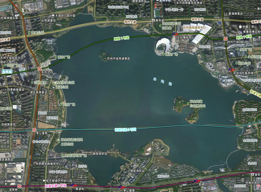 金鸡湖:巨大的人工湖,不是自然水体,而是规划的绝对核心。所有重要公共建筑和商务区环湖布局。
