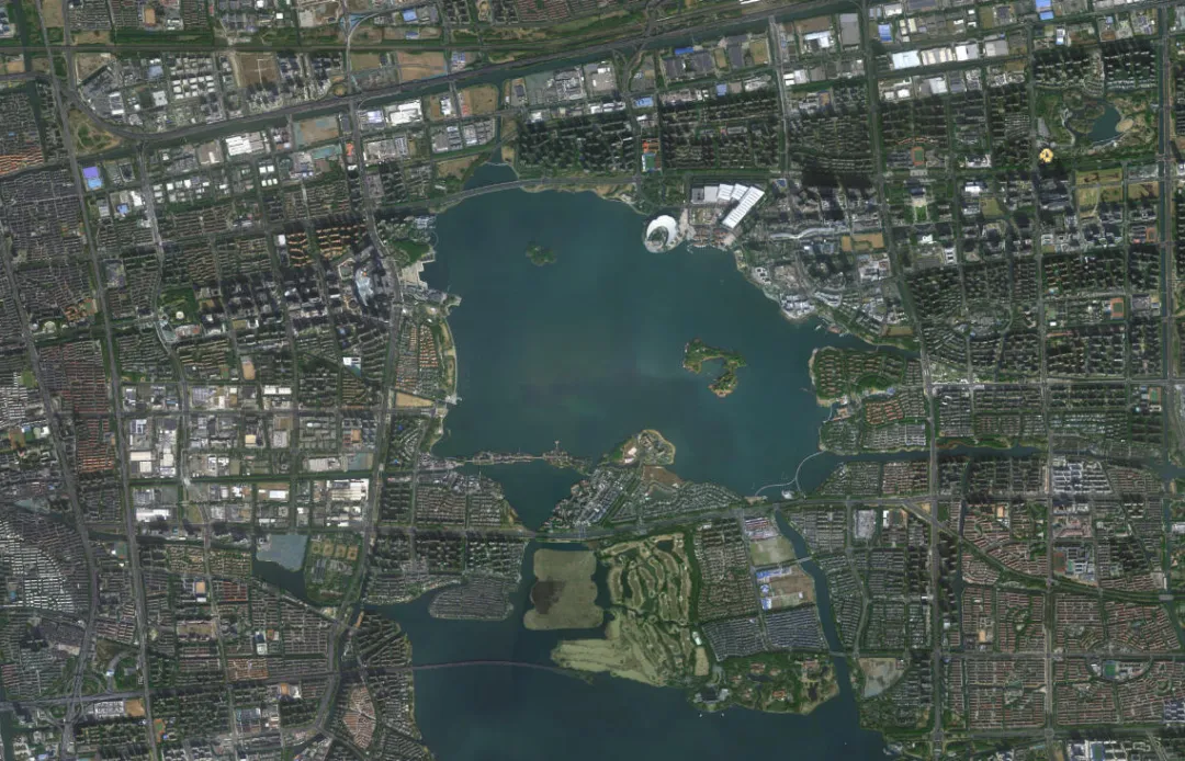 关键节点:太湖新城(吴中区、吴江区部分)围绕太湖岸线展开,卫星图显示其规划强调低密度、生态优先,与工业园区的紧凑高效形成对比。