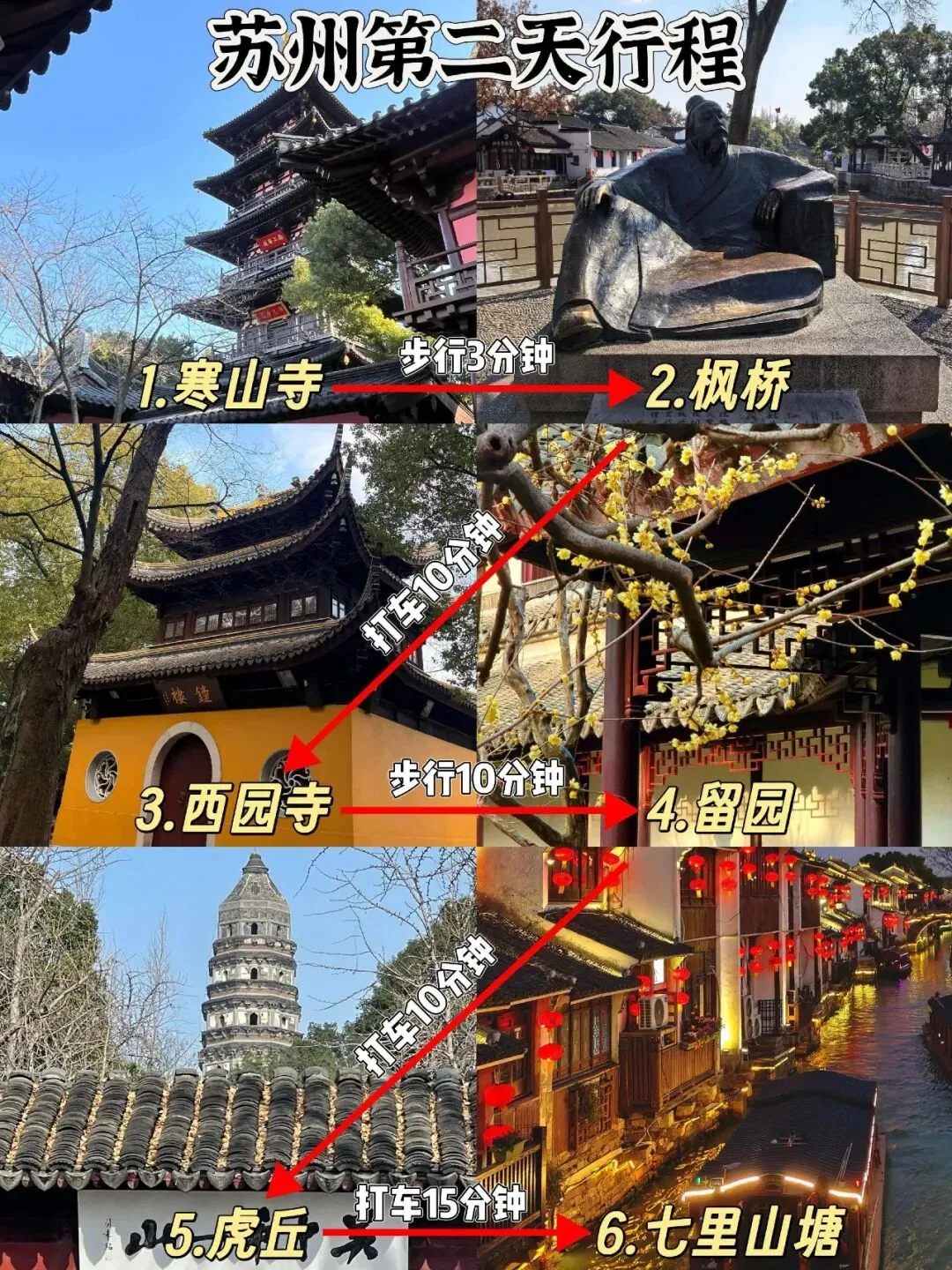 Day2:寒山寺(晨游祈福) → 枫桥(顺路打卡) → 西园寺(素面午餐) → 留园 → 虎丘 → 七里山塘街(夜游收尾)