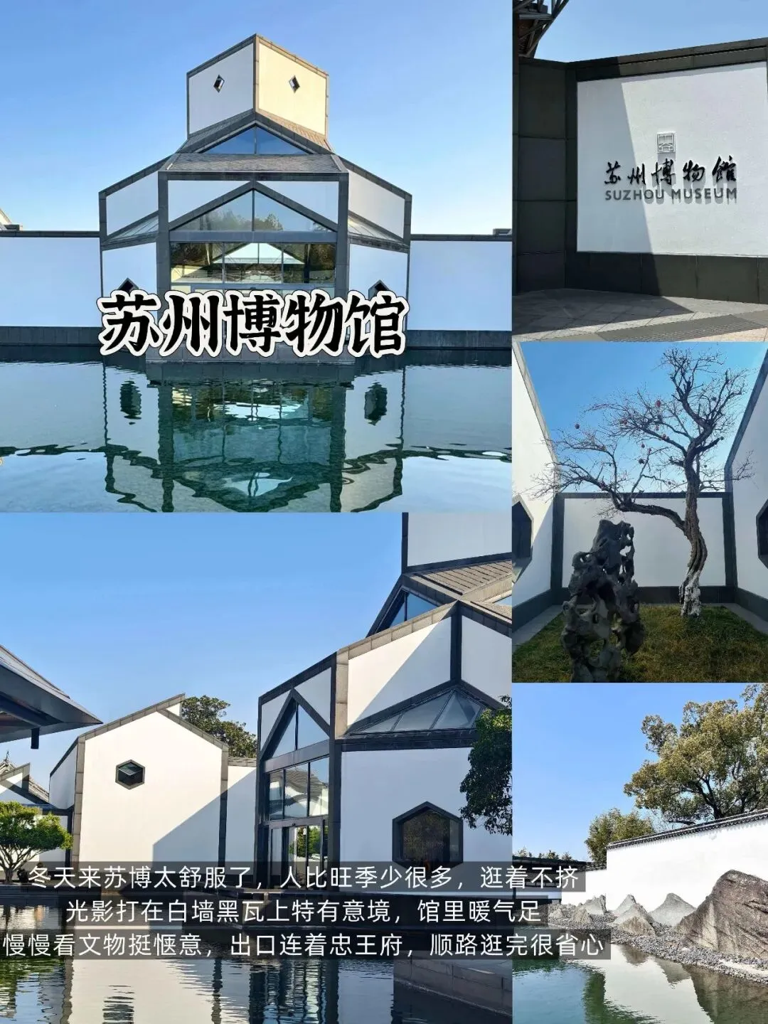 📍 苏州博物馆(9:00-11:00最佳):贝聿铭杰作,白墙黑瓦映光影,冬季腊梅暗香,拍照绝美。免费,提前3天公众号预约,周一闭馆,早到避人流。