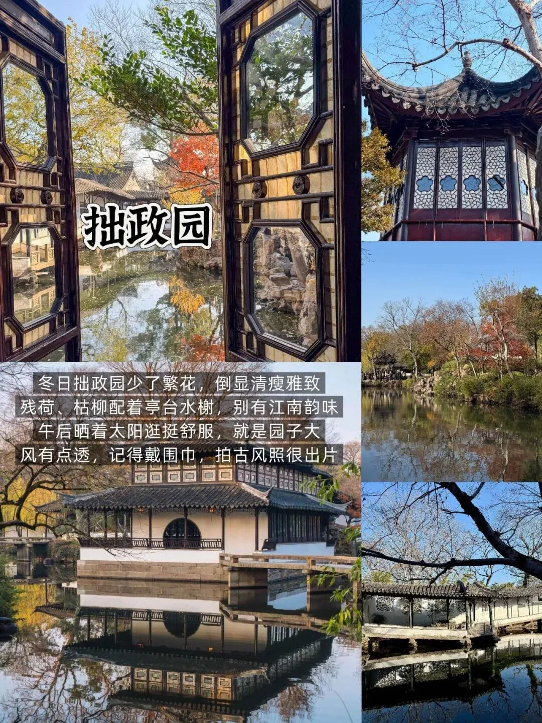📍 拙政园(紧邻苏博):四大名园之一,冬季残荷映亭台、腊梅点缀,尽显江南清瘦雅致。门票70元,提前预约,沿主路线漫游即可出片。