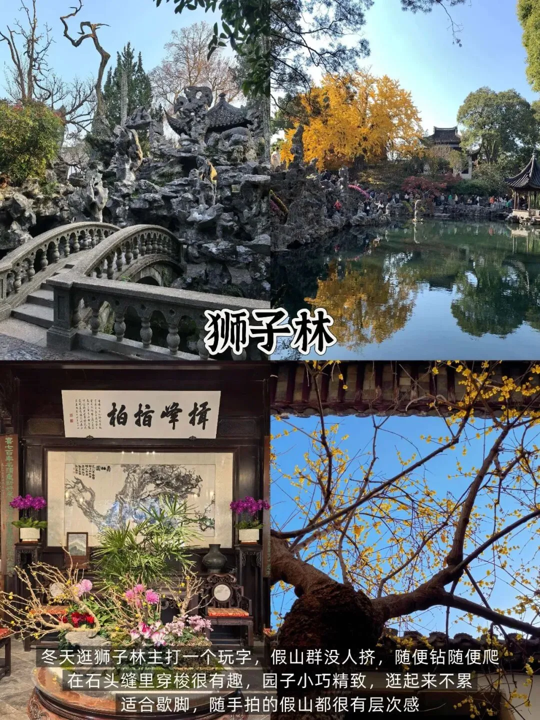 📍 狮子林(步行10分钟可达):以假山群闻名,冬季人少可尽情探秘,百年腊梅飘香,门票40元,适合亲子或爱探险的宝子。