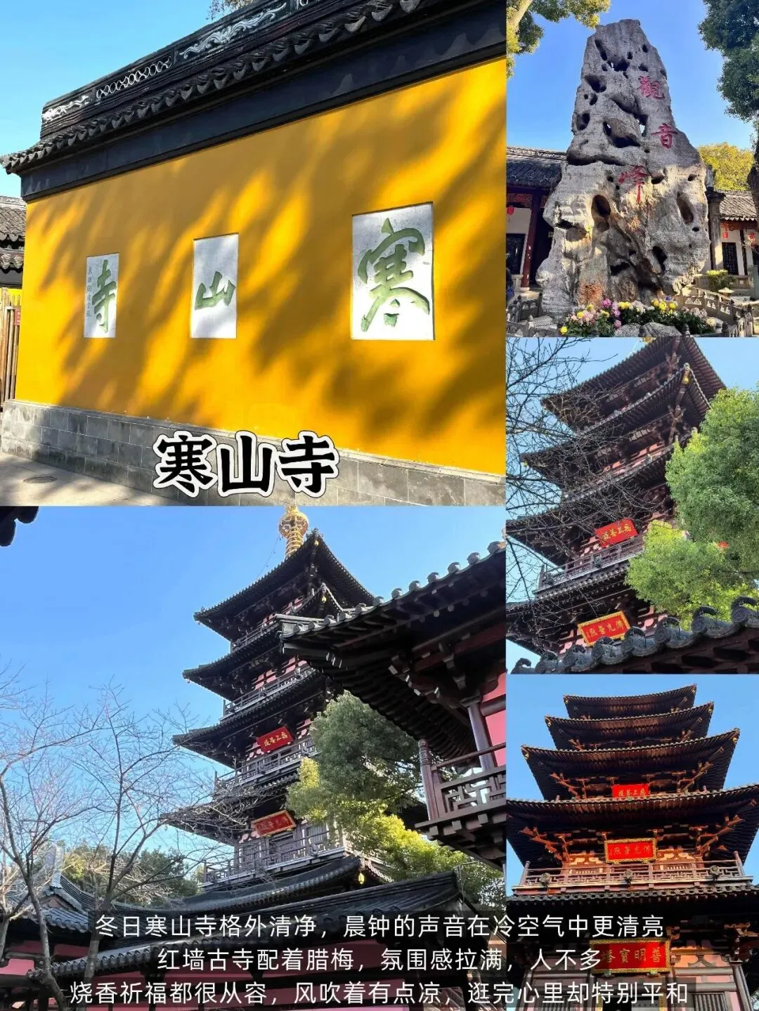 📍 寒山寺(7:30-9:00最佳):千年古刹,冬季晨钟清亮,红墙映腊梅,祈福氛围浓。门票20元,早到避旅行团,享静谧。