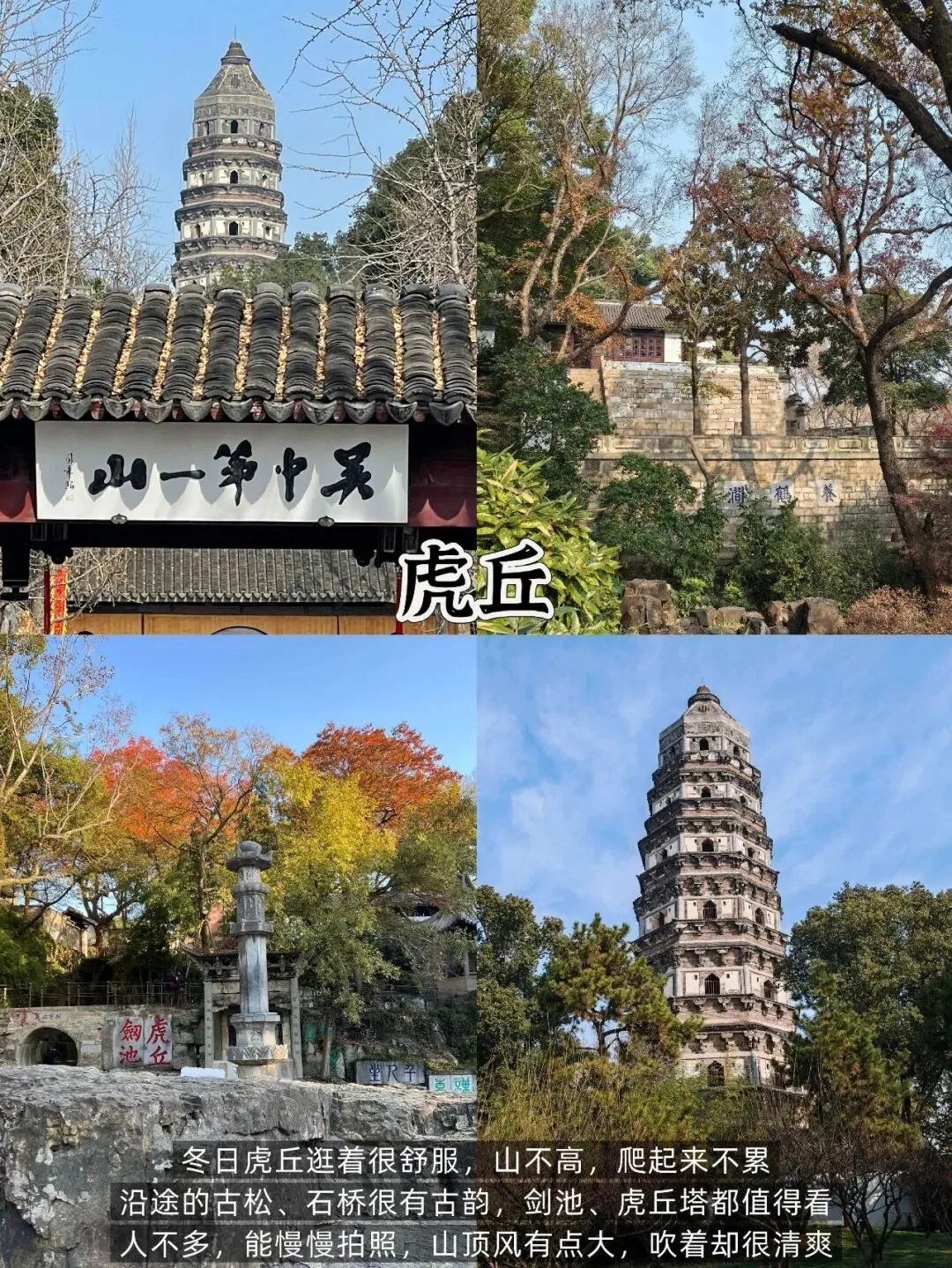 📍 虎丘(吴中第一名胜):古松苍劲、斜塔矗立,冬季更显古韵,登山俯瞰全城,门票70元,穿舒适鞋子前往。