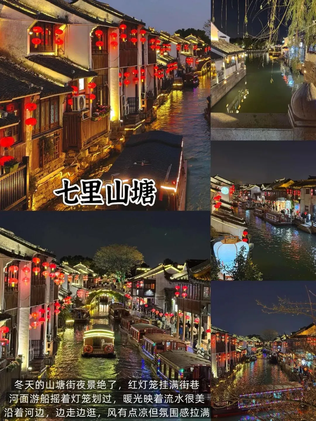 📍 七里山塘街(夜游最佳):红灯笼映流水,暖意十足。可乘摇橹船(人均80元)夜游,或逛吃小吃,免费开放。