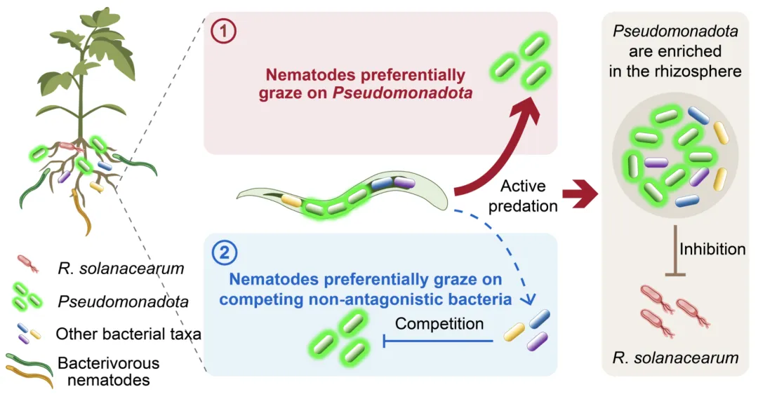 研究结果揭示,线虫与假单胞菌门之间存在显著的生态关联:在那些线虫更倾向于富集假单胞菌门的样地中,细菌性青枯病的发病率明显更低。进一步实验表明,线虫的捕食行为具有高度选择性,能特异性地在植物根际富集假单胞菌门,同时显著降低青枯病菌的密度和植株的发病程度。这种选择性并非随机,而是源于线虫对特定微生物性状的“偏好放牧”——假单胞菌门在线虫肠道细菌序列中的占比超过95%。这些被偏好的菌株通常具备中等水平的拮抗能力、较小的细胞体积以及较高的代谢活性,使其在捕食压力下更具竞争优势。