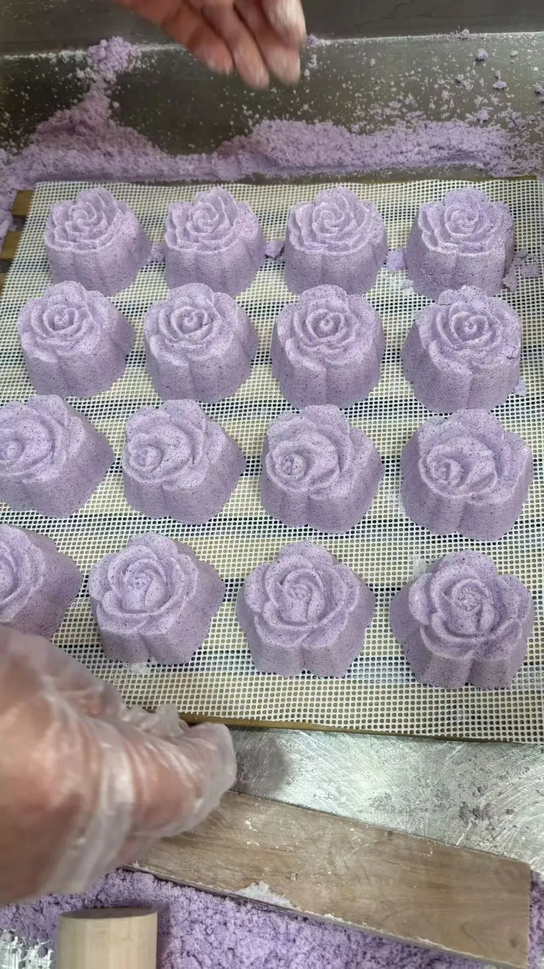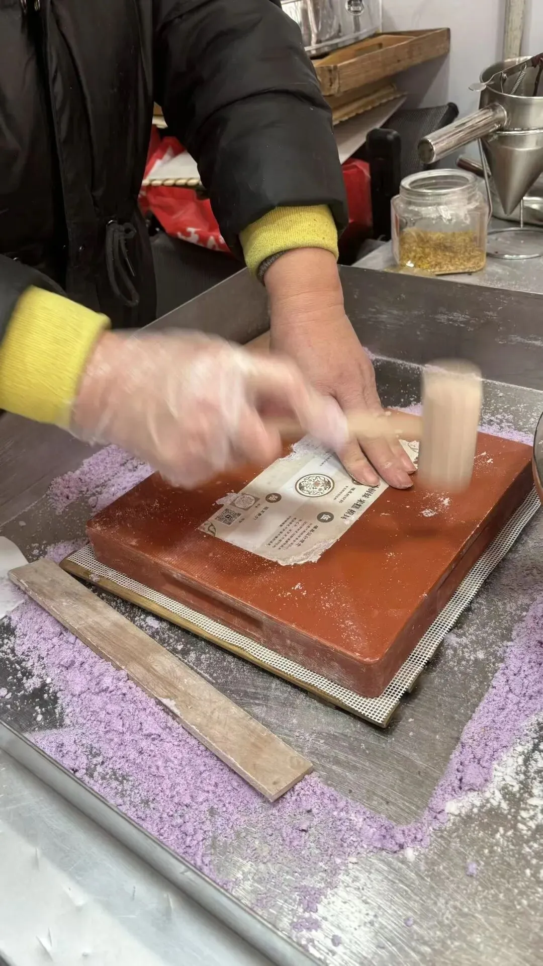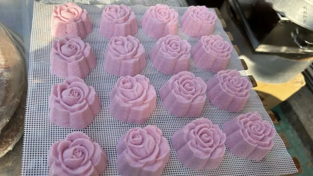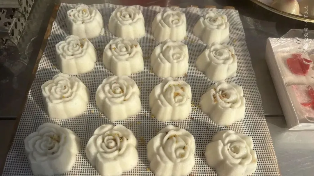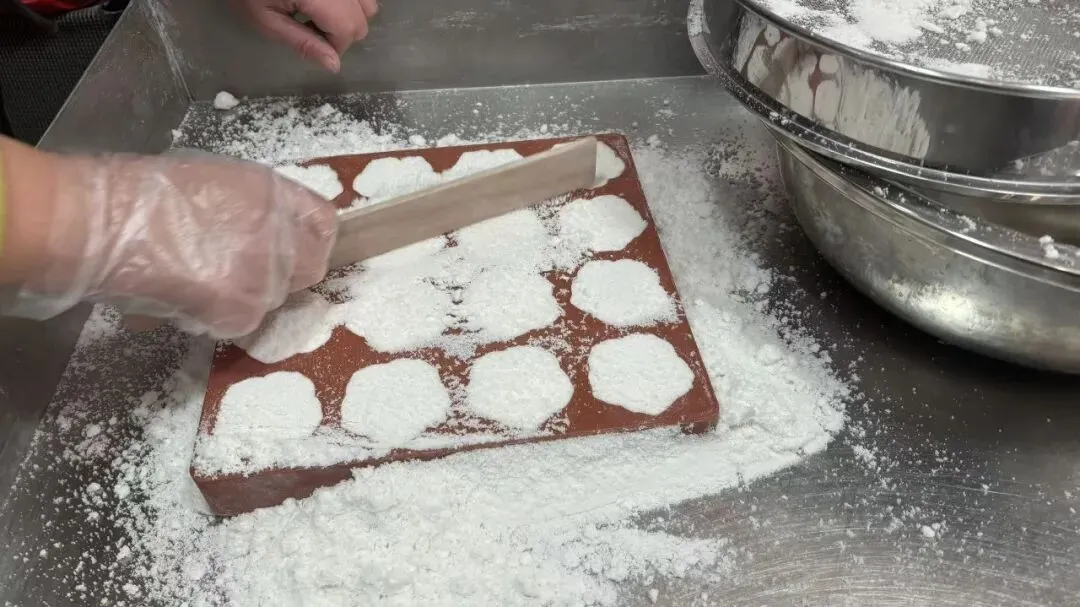 填馅料、刮平糕粉、倒扣脱模,每一步都透着手艺人的巧思,伴着“咚咚”的拍打声,花纹清晰的糕胚就落了下来。