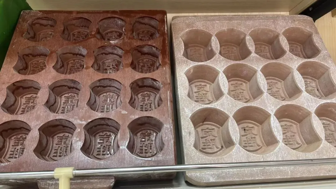 墙角那一排排老旧的木架子太有感觉了,上面整齐摆着各式模具:印着“定胜”“福寿”的梨木印模,边缘被岁月摩挲得油亮光滑。