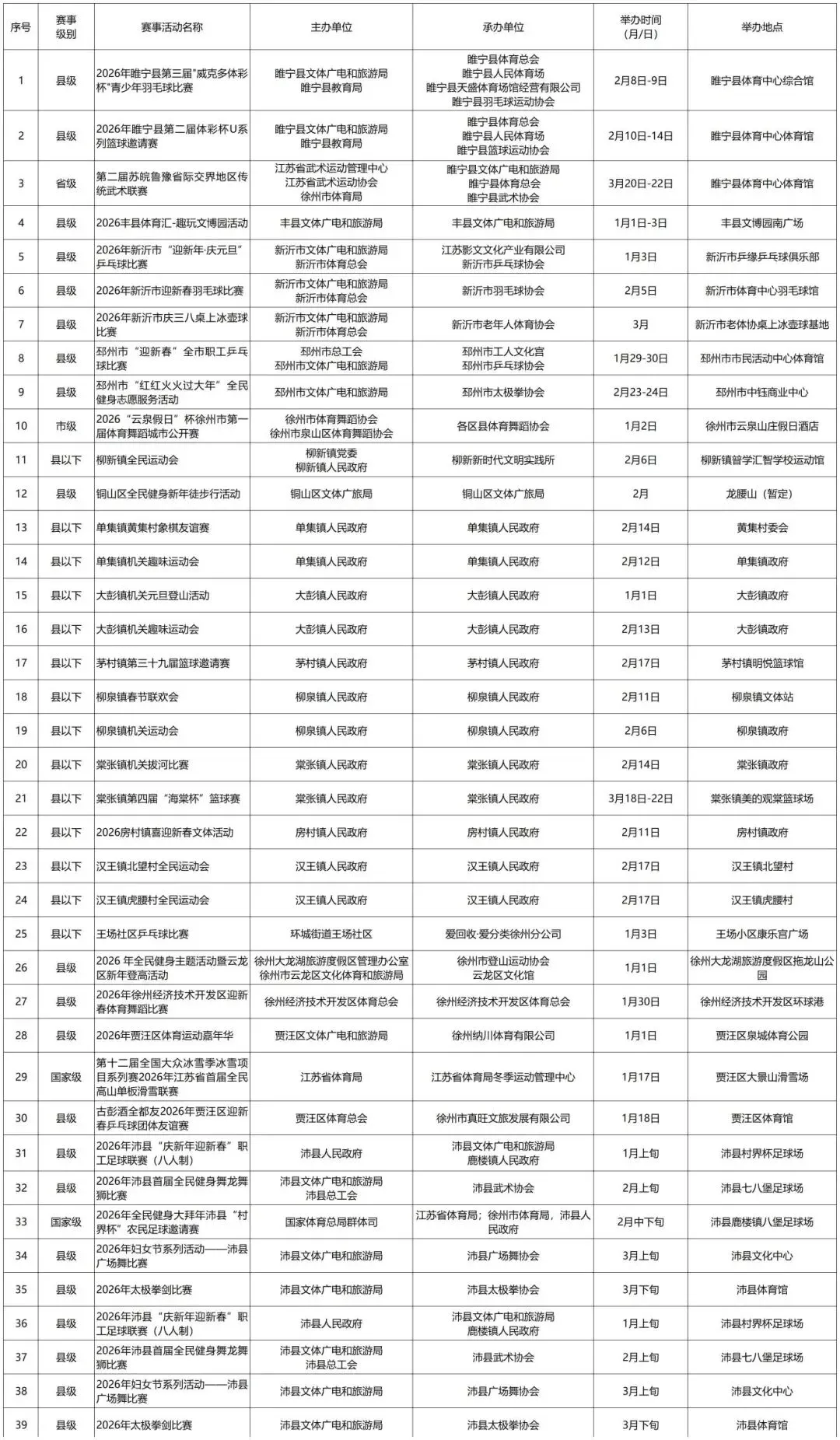 从城市商圈到乡村广场,体育赛事的触角延伸至每个角落。丰县“趣玩文博园”活动将体育与文旅深度融合,吸引市民在文博园南广场参与趣味运动;邳州市“红红火火过大年”全民健身志愿服务活动走进中钰商业中心,通过太极拳表演、健身指导等形式传递健康理念;铜山区新年徒步行活动选址龙腰山,让市民在登山徒步中感受自然与运动的融合。此外,单集镇象棋友谊赛、柳新镇全民运动会等基层赛事,让村民在家门口就能参与体育竞技,享受运动乐趣。