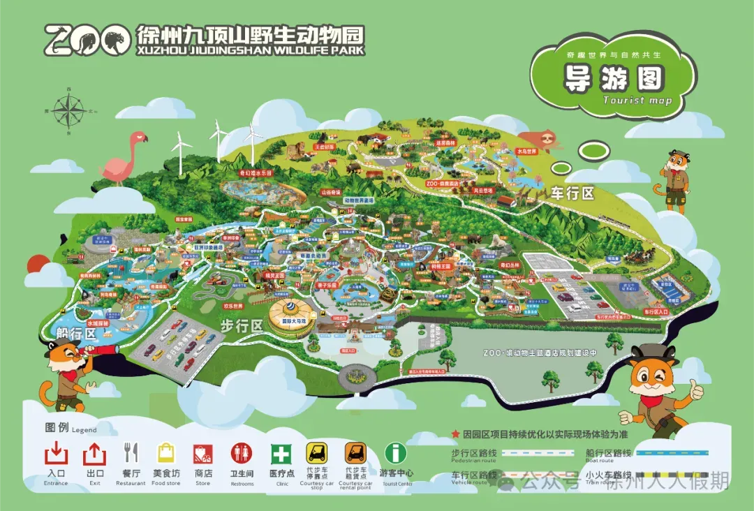 1、车行区:占地约1300亩,采用观光小火车的模式(10元/人自理),线路长7公里,独特的两线路游览方式,采用半散养式生态展出模式。四大区域:风云草场、迷雾森林、水鸟世界和王者部落。园内有斑马、长颈鹿、非洲狮、东北虎、羊驼、丹顶鹤等,小火车自由穿行于野生动物身边,享受与动物近距离接触,更多欢乐体验。2、步行区:占地面积约1200亩,游览线路大约6公里,采用展馆展出互动模式。七大区域:亲子乐园、欢乐世界、兽境探秘、奇幻丛林、国宝家园、树梢王国和精灵王国。