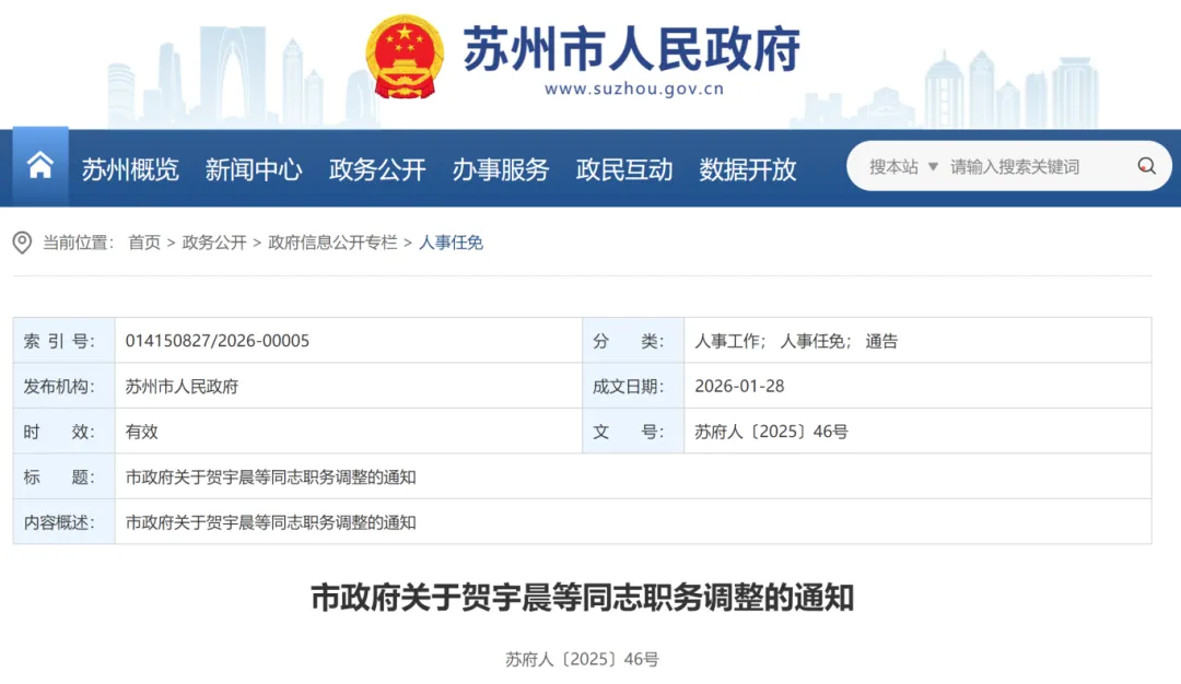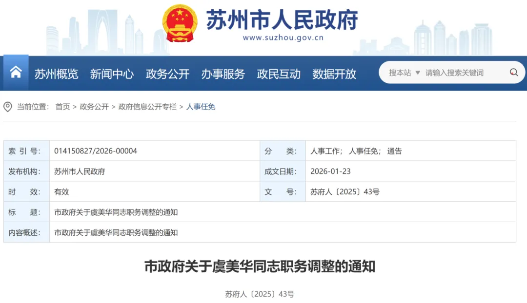 近日,苏州市政府网站公布一批人事调整,具体如下: