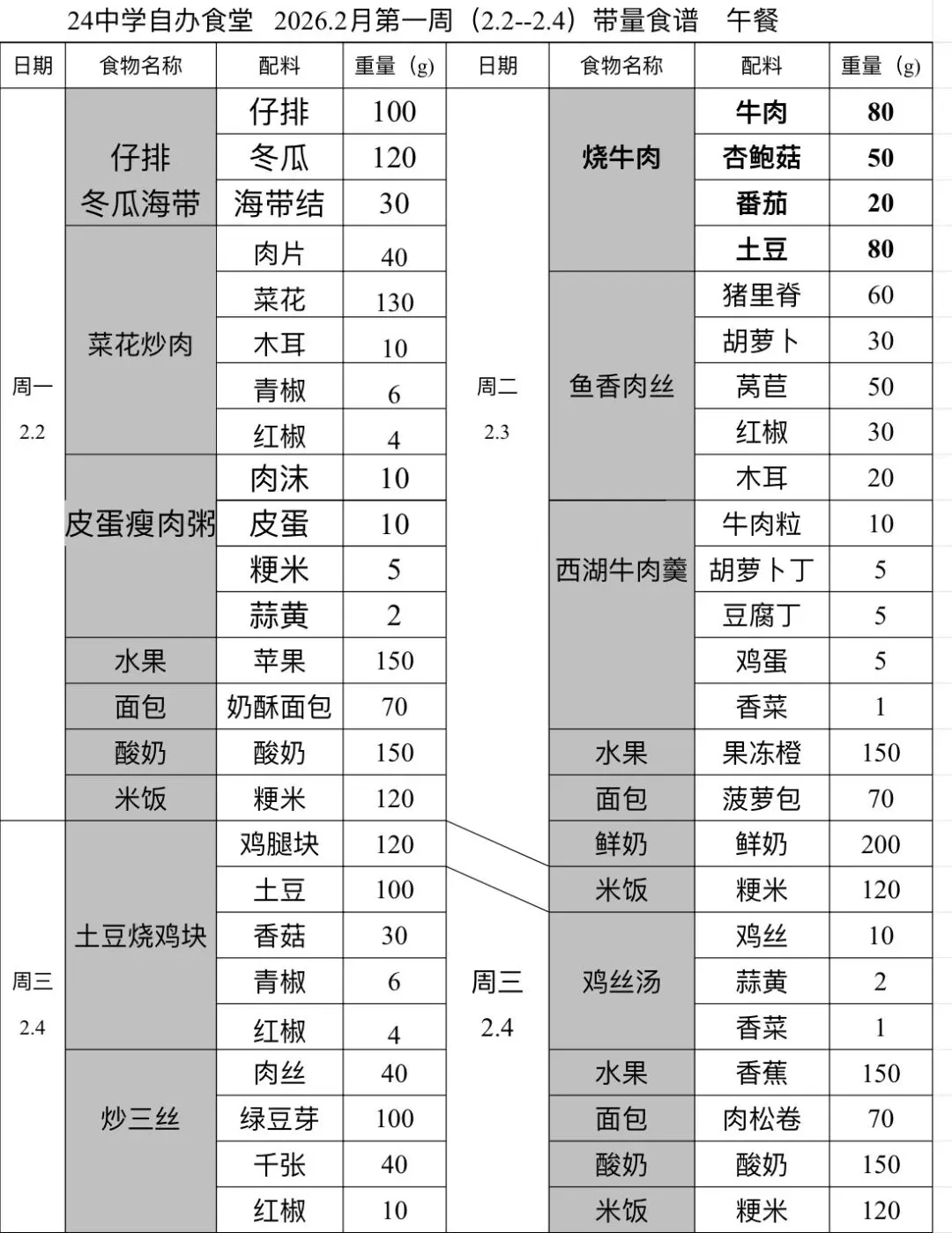 徐州市第二十四中学2026年2月第1周自办食堂带量食谱公示