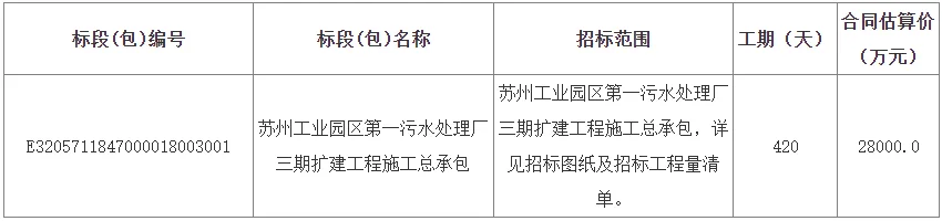 2月4日,苏州工业园区第一污水处理厂三期扩建工程施工总承包招标,预算金额28000万元,工期420天。