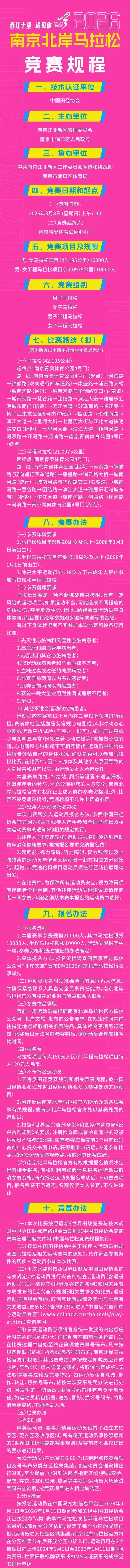 2026南京北岸马拉松定于3月8日(周日)7:30在南京青奥体育公园4号门开跑,赛事规模20000人,设马拉松(42.195公里)10000人、半程马拉松(21.0975公里)10000人两个项目;1月26日15:00-2月10日17:00开放预报名及缴费,2月中下旬公布抽签结果,未中签选手将全额退还报名费。