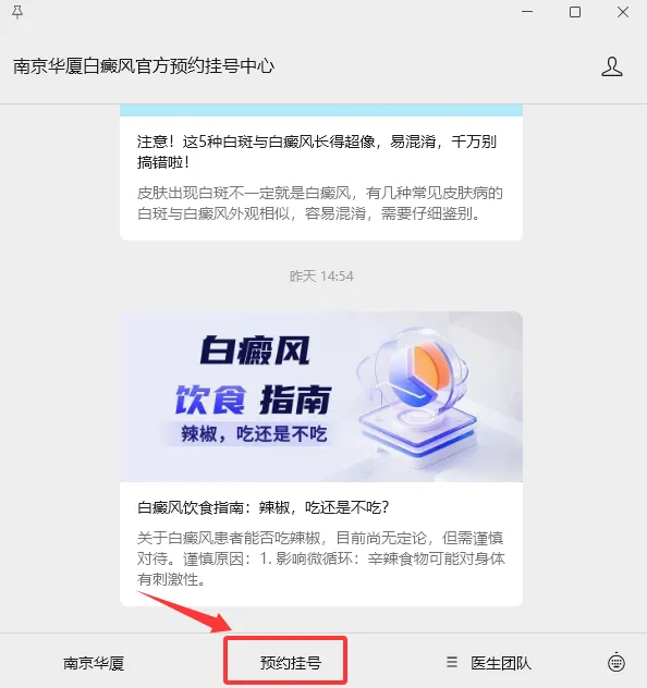 1.搜索公众号:在微信中搜索并关注“南京华厦白癜风官方预约挂号中心”公众号。