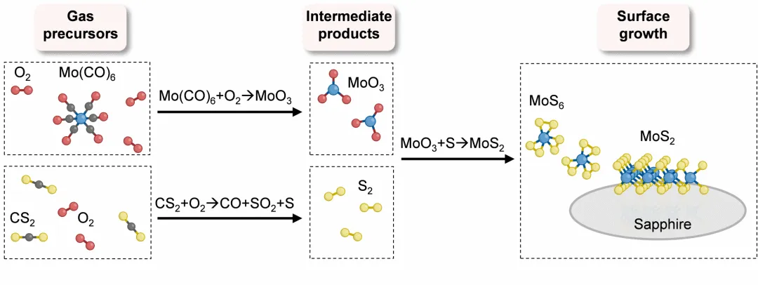 在此基础上,研究提出的 “氧辅助预反应” 策略,突破了传统生长路径的认知边界:通过引入 O₂将 MO 前驱体与硫源预先转化为高纯度金属氧化物和单质硫,既降低了反应能垒(热力学层面),又提升了活性物种迁移率(动力学层面),构建了 “预反应 - 高活性物种 - 定向生长” 的全新生长范式。这一创新不仅解答了 “如何突破动力学限制” 的核心科学问题,更为其他二维材料(如 WS₂、MoSe₂、WSe₂等过渡金属硫族化合物)的制备提供了可迁移的理论框架,推动二维材料生长从 “经验调控” 迈向 “精准设计”。