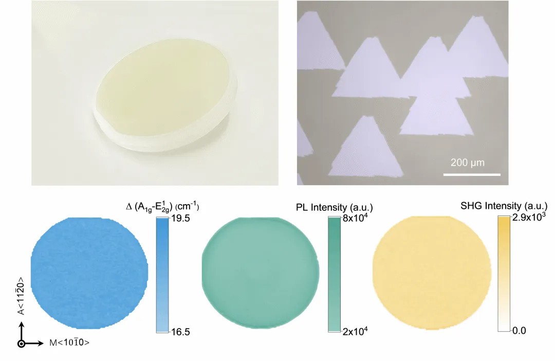 本研究的技术突破直击这一核心矛盾:通过 oxy-MOCVD 技术实现了三重关键指标的跨越式提升—— 晶畴面积较传统 MOCVD 扩大 5-6 个数量级(从微米级跃升至厘米级)、生长速率提升 2-3 个数量级、迁移率突破 100 cm²/V・s,同时实现无碳污染、晶畴高度单向排列与低缺陷密度。更关键的是,研究成功制备出 150 mm 单晶 MoS₂晶圆,这一尺寸已接近工业级晶圆标准(主流为 200 mm、300 mm),直接验证了技术的可扩展性。