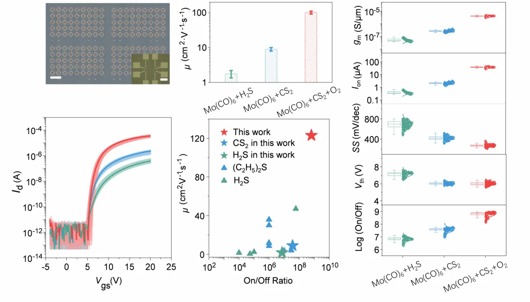 材料性能是器件应用的基础,传统 MOCVD 制备的 MoS₂因碳污染、高缺陷密度与晶界散射,迁移率通常低于 10 cm²/V・s,且开关比、稳定性等关键指标难以满足高端电子器件需求,极大限制了其应用范围。