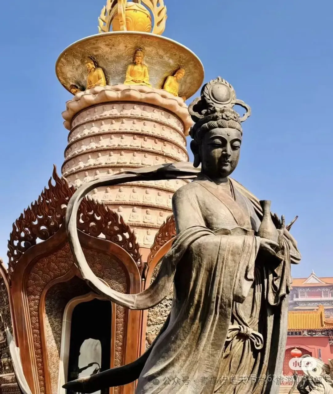 寺中的七佛殿也是国内最大的大雄宝殿,通天阁59.88米,站在台阶下真实感觉很震撼,也是目前国内最高的佛阁,供奉着弥勒菩萨真身-天冠弥勒,佛像高39.88米,也是国内最大的室内锻铜佛像。
