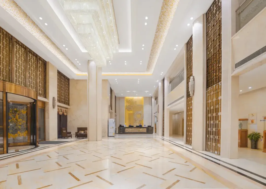 双层挑高空间的大堂内,水晶吊灯、大理石地面、金色装饰技艺互相搭配,眼前一亮,给人一种穿越到上世纪名流世界的既视感。
