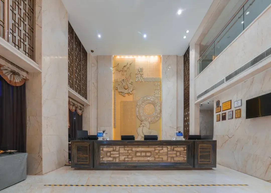 前台背景墙上,更有着“虎踞”“龙盤”的石刻装饰,契合南京地域主题!