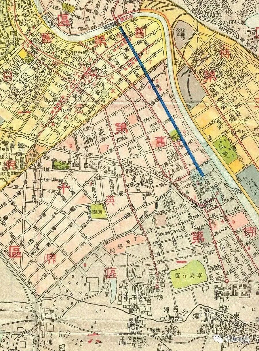 早年间,英租界与特一区的交界并非平滑过渡。1929年日租界发售的天津地图中,二者以第三号路(今徐州道)为界,自海河向西,经第三号路沿海大道(今大沽路)向南,到第六号路(今浦口道)和墙子河(今南京路)交口,转而向西北至平安电影院(老音乐厅)平安桥处,再转向西南,从英国学校(今二十中学)接马厂道(今马场道)。