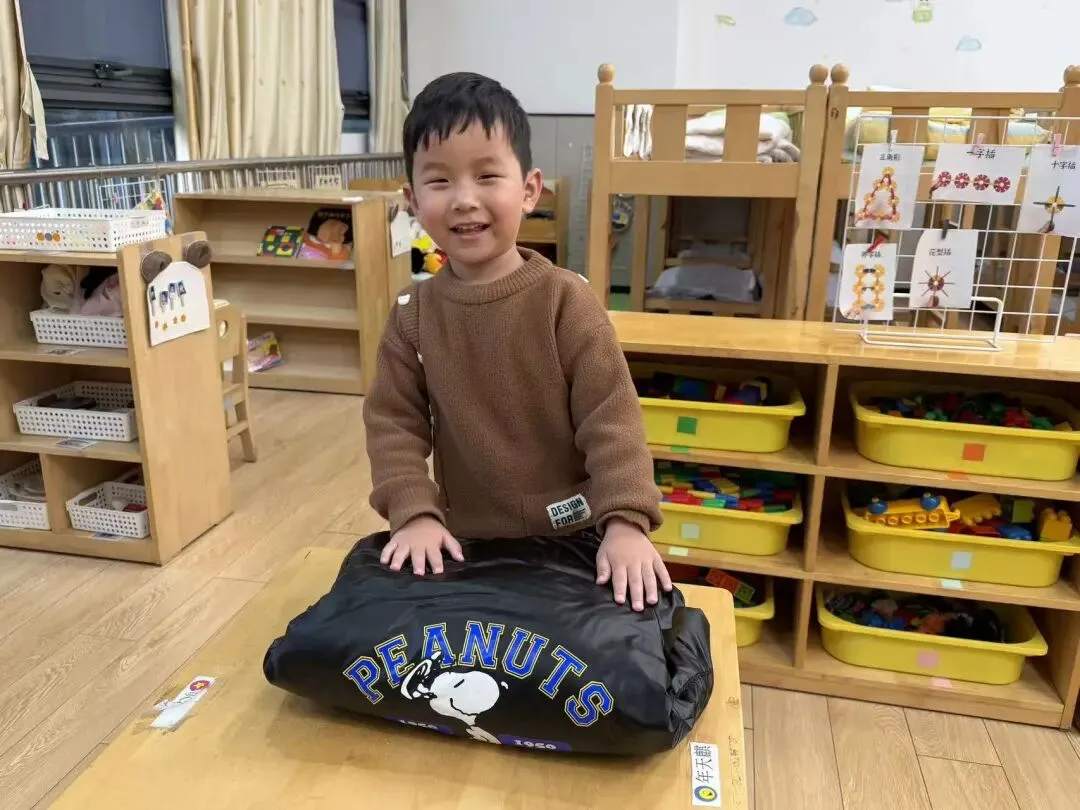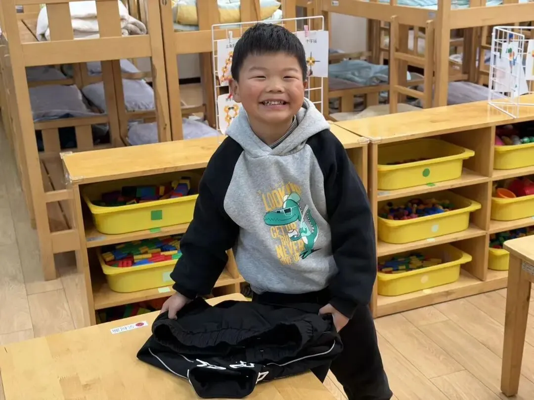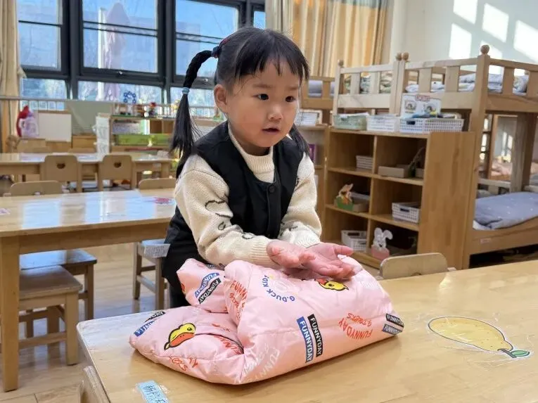 午睡前,我会把衣服铺平,抱抱臂、弯弯腰,叠得整整齐齐。
