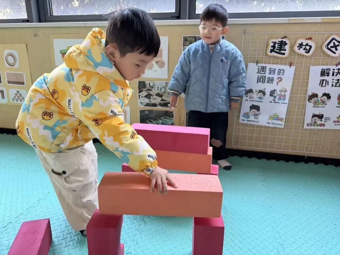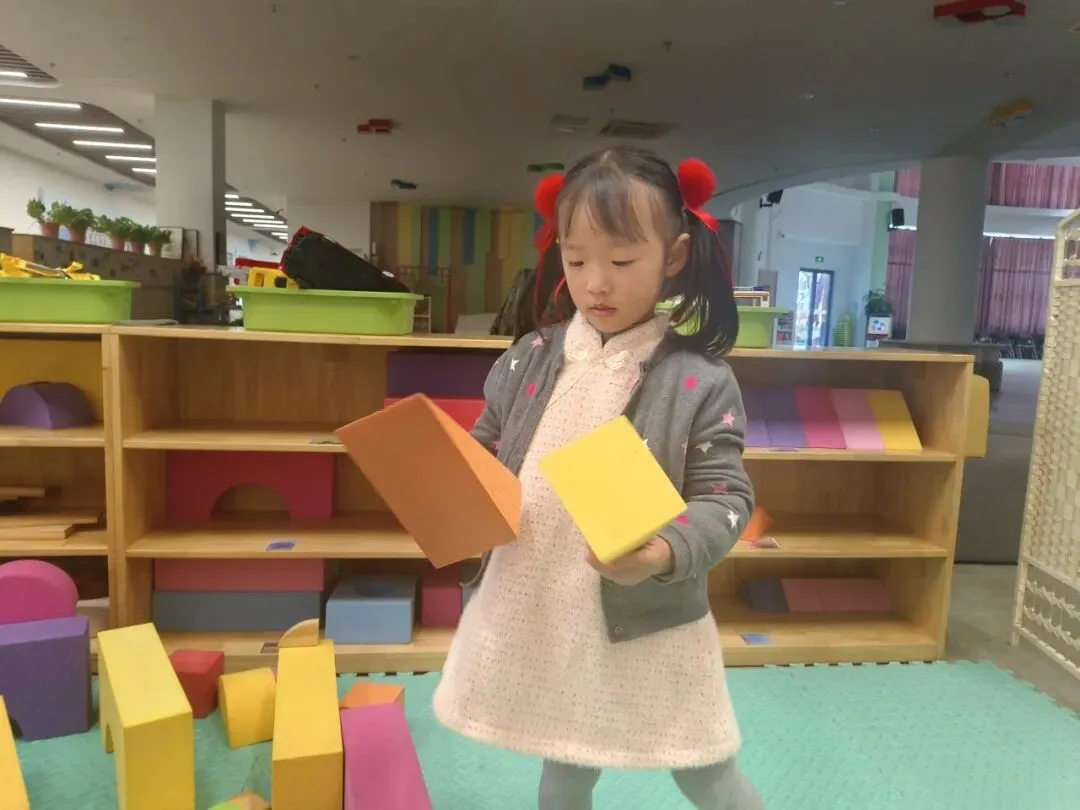 我喜欢在建构区玩游戏,现在的我会把积木一块一块挨个连接起来,搭出长长的“积木小火车”。