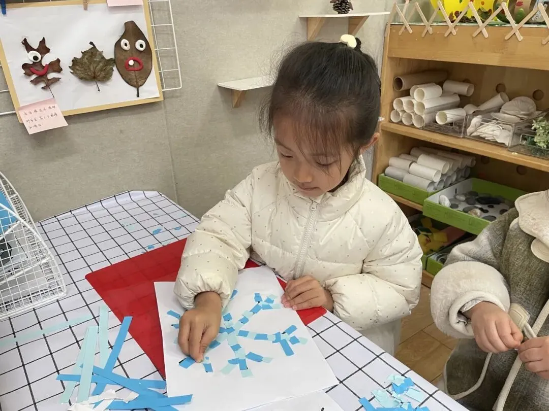 我学会了在美工区用水粉笔画画、用胶棒贴出漂亮的雪花。