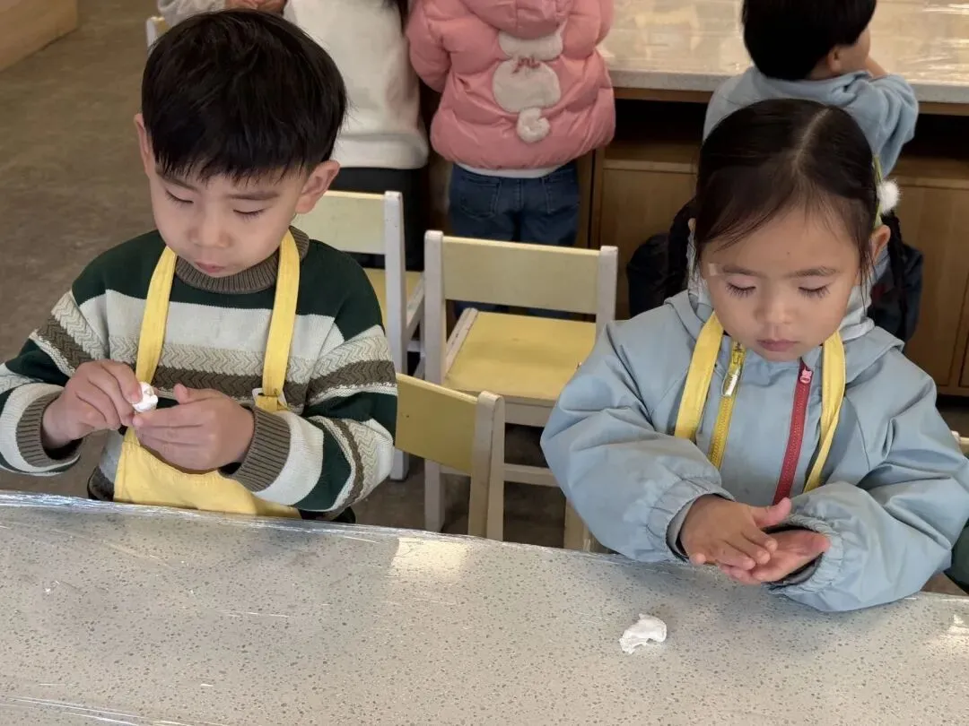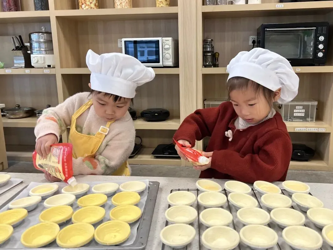 我们会在小小生活馆自己动手制作美食:冰糖橘子水、红糖小圆子、青菜圆子汤、蛋挞等等。