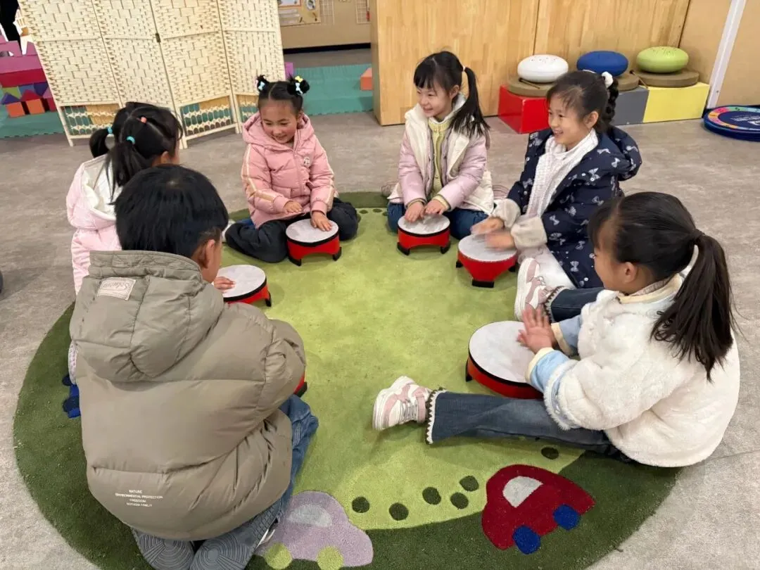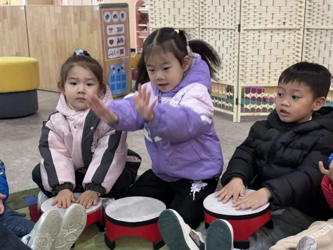 室内音乐区有各种各样的乐器,老师教我一边念儿歌,一边有节奏地敲小鼓。