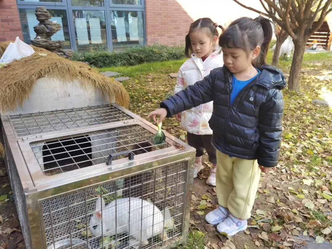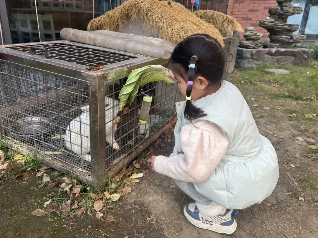 幼儿园的室外专区也很好玩,我在野趣园,给小兔子喂好吃的小白菜。